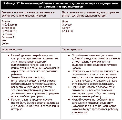 Таблица 37. Влияние потребления и состояния здоровья матери на содержание питательных микроэлементов